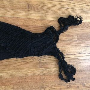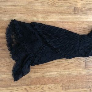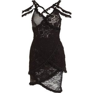 layered ruffle dress with crocheted and lace panels | double off-shoulder ruffle sleeves | asymmetrical layering | crisscross straps
