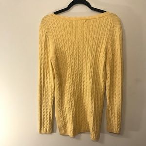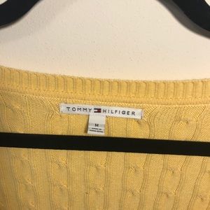 This yellow v neck sweater with small side slots and Tommy Hilfiger logo on the left sleeve.