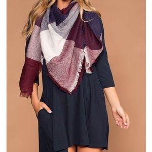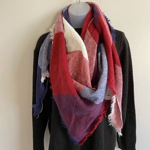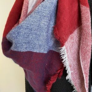 A large blanket scarf in burgundy and dark blue plaid designed with fringe frayed end in a long triangular fold.