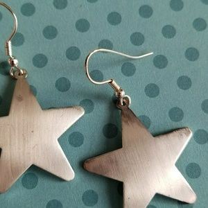 This fun pair of vintage Star earrings is made of silver tone metal. They have hook backs for pierced ears. This pair is in very good preowned condition with normal minor surface wear and dark age patina to the metal. From a smoke free home :) each measures approx 2" long.