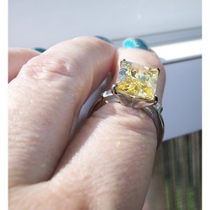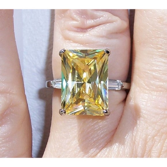 This beautiful fashion ring has a radiant cut 14x10 (mm), 8.47 carat canary yellow CZ in the center with a clear baguette on each side. All stones are AAA Grade Cubic Zirconia and have lots of sparkle. Solid TK316 Stainless Steel (no plating) is high polished to a mirror finish. Stainless Steel Jewelry is hypo-allergenic, non tarnish and never turns your finger green. It is a darker metal than sterling silver.