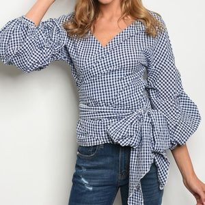 Navy & White Gingham Wrap Top. 3/4 puffy sleeves. V neck. True wrap. 100% cotton. True to size. I am modeling size Small. New Boutique Item. #BD37
