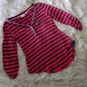 Red and navy Henley top from Anthropologie // Postmark. Features a hi low hem and roll tab sleeves. Size extra small.