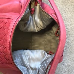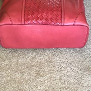 Excellent, gently used condition. About 14” across, 10” high at midpoint and 4 1/2” deep. Plenty of room. Inside, 1 zippered pocket and 2 slip in pockets. A small mark on one side, as pictured and one shown in the last picture.