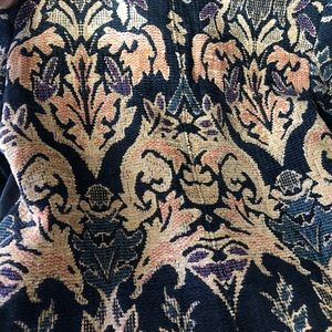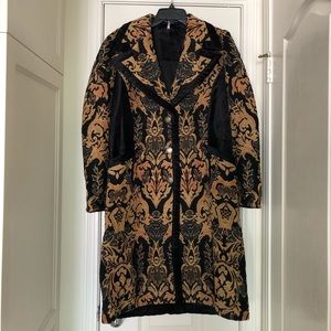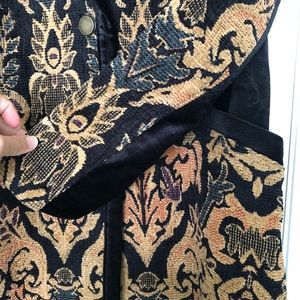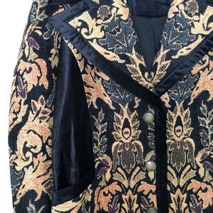 Gold and black tapestry coat blocked with black velvet panels. Lined. New with tags.