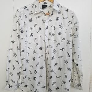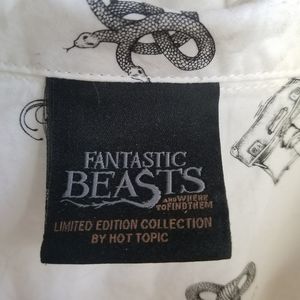 Hot topic exclusive fantastic beasts and where to find them Newt scamander button down shirt featuring symbols of creatures from the film.