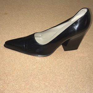 Black glossy leather pumps. pointy toes with round edges. 4’ stacked chunky heels. Leather lining. Leather soles some normal crease wear on top & sides of vamps. Some scratches on bottom area of heels. Good condition. Easy to walk in. Comfortable & super stylish
