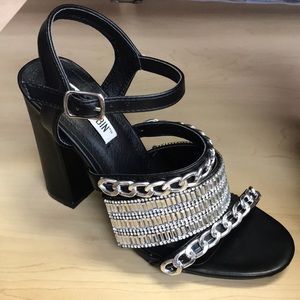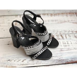 Crystal embellishments and chains pair together in this block heel sandal for a mixture of hard edginess and graceful feminine chicness. Sizing: True to size. - Open toe - Side buckle closure - Wide and thin embellished straps - Block heel - Approx. 4" heel - Imported
