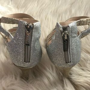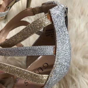 Strappy Silver & gold glitter heels. Never worn. View PICTURES❗️❗️❗️ to see orange dried glue. I think that’s what it is 🤷🏻♀️
