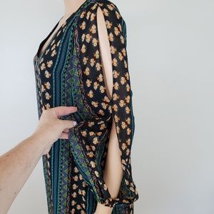 Pretty dress or tunic top. Size XL. Lined. Poly material. Sheer sleeves with cut outs. Approx measurements 19 in armpit to armpit laid flat and 23 in long shoulder to hem. Gently worn but in excellent condition.