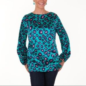 Silky soft animal print satin fabric make up this gorgeous top. There is a single button closure at the back with a bra friendly diamond key hole opening underneath. Long sleeves with elastic cuffs. Pair this top with skinny jeans or colored denim. Anyway you wear it, you’re sure to turn heads with this print and style. True to size.