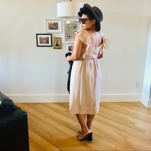 Such a beautiful dress by Theory! Love the ruffled sleeves, midi length, and of course the softness of 100% silk. Just a well-designed and quality made dress. I would personally pair this with a leather jacket to contrast the feminine with a bit of an edgy look. In excellent condition. No tears, stains, or damage. Enjoy!