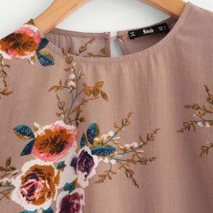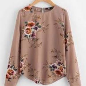 Never been worn! It did not come with tags, but I’ve never used the Blouse. Pretty tan color with a flower design. Has buttons at the bottom of the sleeves and at the top of the back. In perfect condition. Great for work.