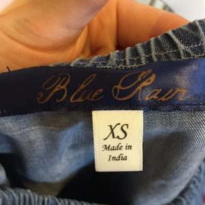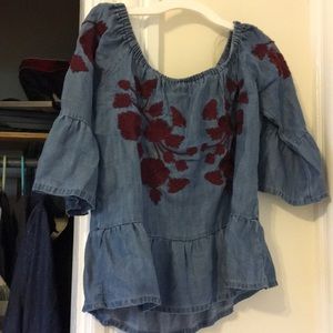 This shirt is in great condition! Beautiful chambray color with red flower design. Fabric is extremely comfortable. This is long sleeve and sits right off the shoulder. Still has clear straps for hanger attached. Brand is Blue Rain but it was purchased from francesca’s. Goes great with shorts or jeans.