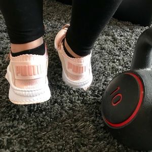 Puma Tsugi Shinsei Training Shoes Peach/ Blush Pink/Rose gold color is between those 3 not sure exactly , super chick, comfortable training, workout sneaker and highly fashionable. $115 + tax Retail