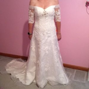 This is an absolutely gorgeous off the shoulder short sleeve a-line embroidered floor length wedding dress in off white. There are buttons all the way down the back. Extraordinarily sequin, lace, and pearl details. It was bought for my daughter who decided to elope. This dress would be perfect for a formal wedding or a destination wedding! It would even be a very beautiful prom dress. Never worn. NWT Could fit a size 8 too.