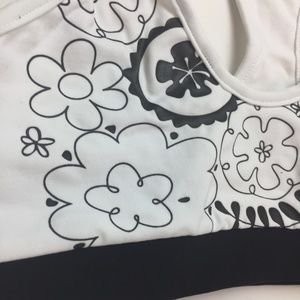 Lino Fitness sports bra top in white with a thick black band underneath the chest for extra support and a floral print. Racerback.