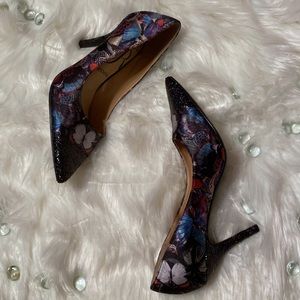 J. Renee multi-color pump with black sequins. Shoe is made of different colorful designs and a black sequined toe and heel. Sequins have specks of different colors throughout. Size 7W with a 3.5 inch heel. Great condition. No shoe box
