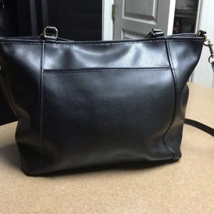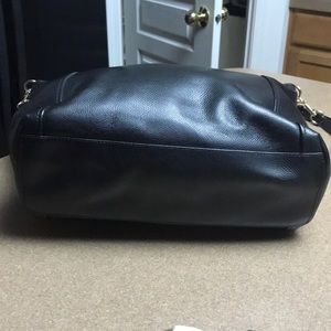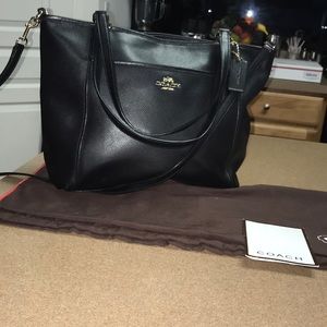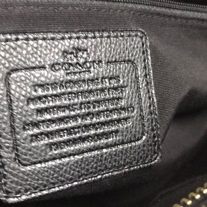 Authentic Black textured leather. Gold tone hardware. Zip closure Exterior large slip pocket. Hang tag. 8.5’ hand straps. 22’ adjustable & detachable Shoulder strap. Creed label zip & slip pockets inside clean lining. In excellent condition. Like new. Roomy super stylish & convenient. No serial numbers on the new coach bag bought within the last year. The little white tag documents it authenticity. This bag is only 4 months old. Storage accessory & authenticity card included