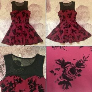 Cute cocktail dress with sweetheart, illusion neckline in red and black rose print. Size small. Side zipper. Slight wear on the butt area (as shown in picture), but not at all noticeable while wearing. Only ever delicately washed and line-dried.