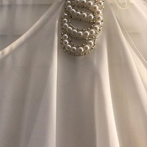 Elegant and flattering dress with sheer top and scalloped skirt. Gorgeous pearl enhancement on shoulders. Perfect for a wedding or other special occasion. Only worn once. Pristine condition.