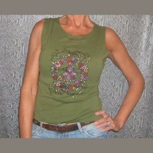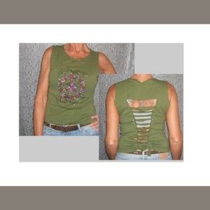 This unique upcycled halter tank top is crafted from a recycled green t-shirt, featuring a hand-painted floral peace sign and delicate butterfly artwork. The collar, sleeves, and bottom band have been removed, while the back is expertly slashed and woven for a sexy, bare-back look. Designed with a cinched corset-style fit, this one-of-a-kind piece is a size medium and comfortably fits up to approximately a 38-inch bust. Perfect for those who love eco-friendly, artistic fashion with an edgy twist!