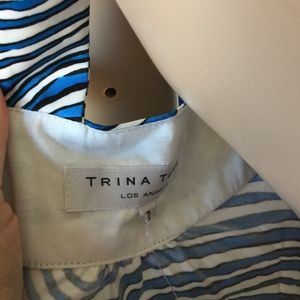 This is so cute on. This will fit if you're typically between a 2 or 4. The fabric is super soft. 70% rayon and 30% silk. It's unlined, except for the bust and upper back section. Black, white, blue and gold. Look at how the lines match up so well in the back and the bust. Great deal on this designer dress. Attention to detail on this dress.