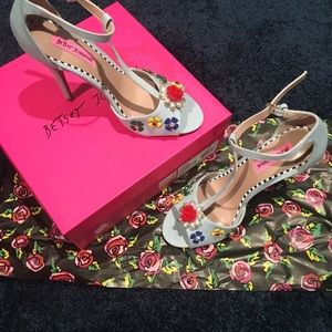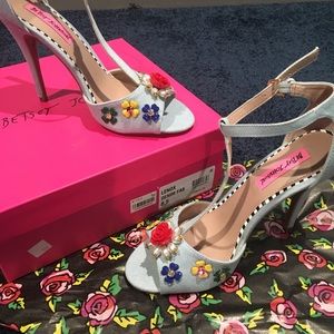 Betsy Johnson Lenox Denim Fab Shoes 👠 The Lenox is a classic open toe sandal with tee strap silhouette adorned with floral appliqués and embellishments. 🌹✨