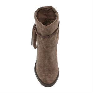 Taupe Distressed Tassel Block Heel Ankle Bootie
