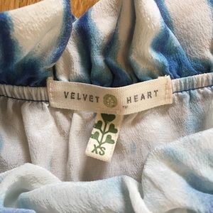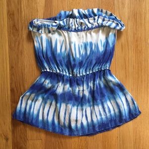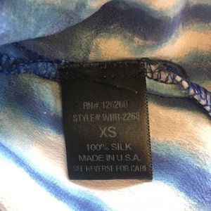 Beautiful blue silk top with tie dye design by Velvet Heart. Sleeveless with ruffle at top and cinched elastic top.