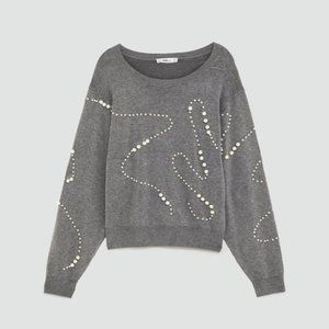 Round neck knit sweater with long sleeves and ribbed hems. Pearl bead appliqués on the front and on the sleeves.