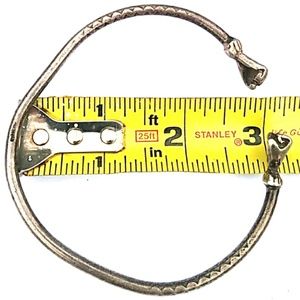Awesome vintage SOLID sterling silver (29+g!!) *Unisex* cuff &/or arm cuff in good vintage condition.. quite a bit of oxidation/patina but wld easily polish off - if desired. Will polish, prior to shipment, upon request. New pol.cloth included as well! Not really malleable so I'm unsure if the slight bend is intentional or not.. Ea.end has a fist+some etching detail on the cuff,Stamped STERLING &tested!ask any ?💕