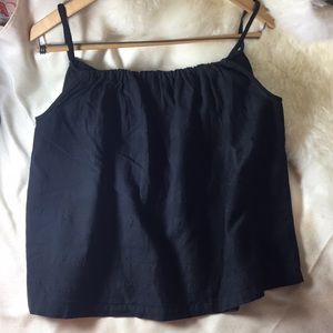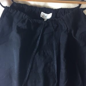 Lou & Grey Top is 22 “ (S), 21” (XS) long measured from “spaghetti-strap” shoulder, 13” (S), 12” (XS) long from underarm. 22” from side seam to side seam underarms. Drawstring in front to adjust neckline (photo #2). Armholes with spaghetti straps are 18” in circumference. 50” around at hem. 100% black cotton broadcloth. Machine wash and dry.
