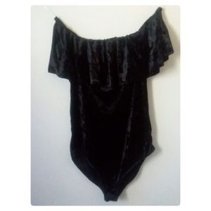 Super soft off shoulder body suit in black. Strong elastic in the neckline to ensure worry free wear. Beautiful velvet for warmth and comfort! Easy 2 button snap closure and stretchy to enhance all your best features! 95% polyester 5% spandex