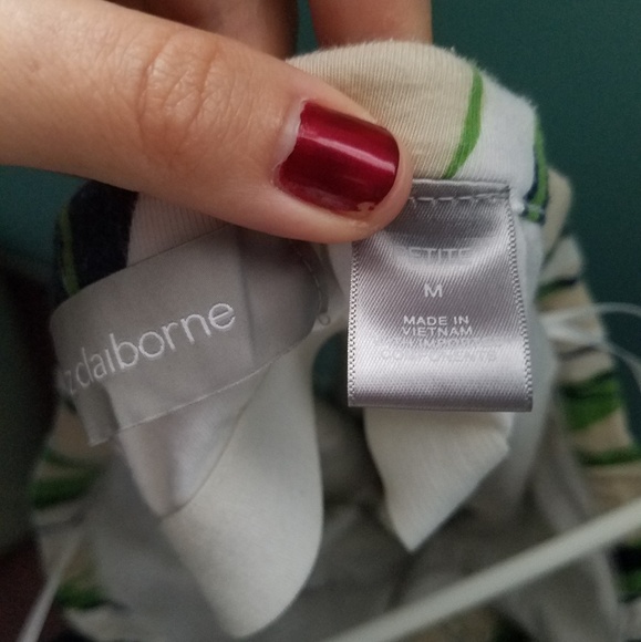 Liz Claiborne halter top detailed with green, dark blue, white, & cream colored stripes. Inside has a bra support. Petite medium.