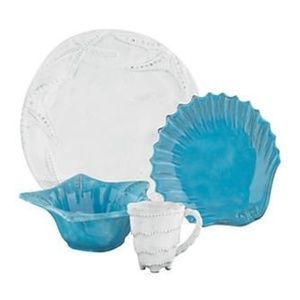 A shell collector's treasure for the table, Incanto Mare features the shapes of the sea on white and aqua pieces for an ocean inspired setting!