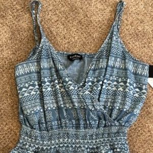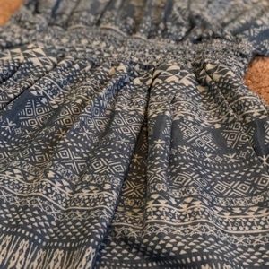 Super comfortable chambray romper with chic tribal print. Adjustable straps and side pockets. Machine wash cold.