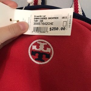 On hold!! Brand new! Red Tory Burch canvas backpack! Super adorable for traveling I just never used it! Retails at $250. Details from online in photos!