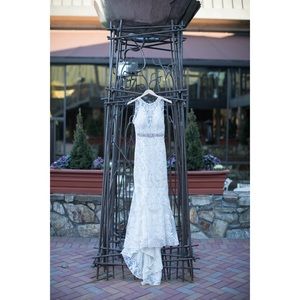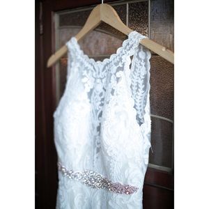 Timeless and elegant, this lace sheath wedding dress features a modern illusion deep V halter neckline, a stunning, scalloped plunging back, and illusion straps. Finished with covered buttons over zipper closure.