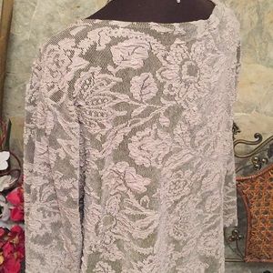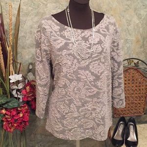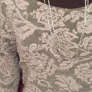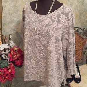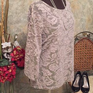 Cityknits shirt top blouse tunic . Size 1X. 44% polyester 52% acetate 4% spandex. Approximately 28 inches long with 2 1/2 inch side slits. This top has a lovely rounded collar and raised lace effect to it. It has some stretch and give due to the spandex. It is a very neutral color that will go with anything and everything. Black and gray.. you will find many uses for this top. dress it up or wear it with jeans. Very classy!