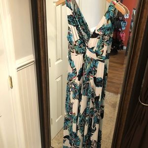 Feather print with V-neck maxi dress. About 59 inches from shoulder to hem.