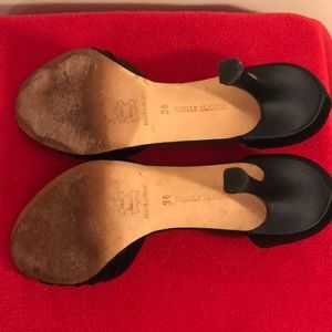 Manolo Blahnik black satin open toe heels. Gently worn & in great condition. Heel pads can be removed. Heels approx 3 1/2” high. Size 36. (No dust bag or box)