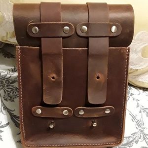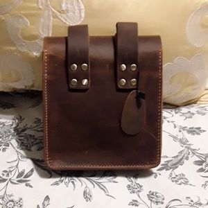 This pack has a vintage masculine feel. This leather is easily distress to give it that rugged appeal over time. Please note that is the nature of crazy horse style leather. Roomy interior, saddle bag like closure straps (see pic 3), backside has two loops to slide your belt through. Great for hiking, walking,riding or extra storage.