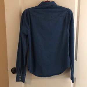 This is seriously the cutest denim shirt I’ve ever seen. I wish it fit me! Denim snap button up! Puff sleeve with a little tulle in the sleeve for that adorable puff. Nothing says I’m fancy than this denim snap. Brand new with tags!
