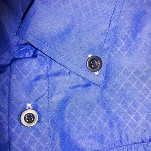 Classic button down, collared shirt with a subtle retro dark sapphire pattern. Solid and masculine contour line for a more fitted, tailored look (no pockets). Wrinkle-resistant, breathable, lightweight and quick dry cotton polyester blend material. Black buttons, white accent threading, crisp buttoned collar and sleeve cuffs. True to size.