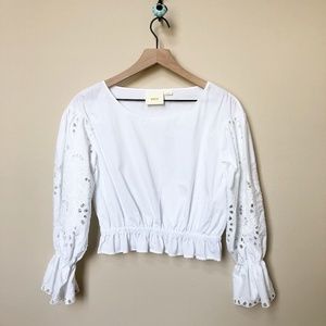Maeve from Anthropologie eyelet sleeve crop top. Beautiful eyelet detail on each sleeve, elastic waist and elastic wrists. Excellent condition.