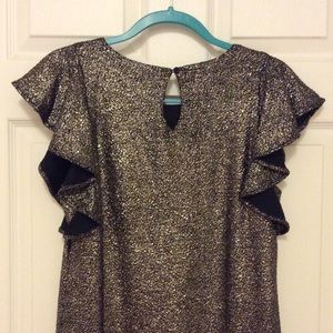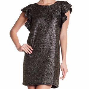 Flutter sleeves and a keyhole back detail this metallic shift dress.