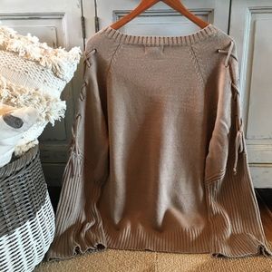 Darling Boutique Sweater. One of our favorite sweaters to come out this season! This darling knit features a soft mocha brown base, v-neck and the sweetest tie detail sleeves. Flattering fit.
