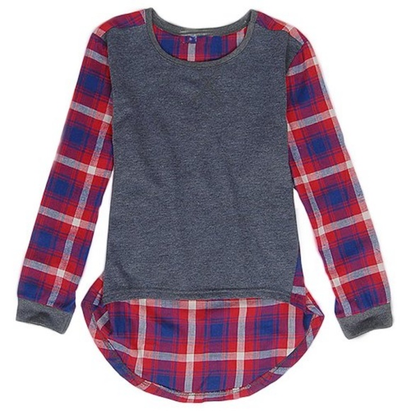 This super cute, long sleeve tunic is made out of a lightweight cotton/polyester blend tee shirt material. The front and cuffs are a solid gray. The sleeves and the back are a red, white, and navy plaid. The bottom hem is a flattering high low. True to size. Approximate length from shoulder to front hem 21" and shoulder to back hem 25". Listing is for shirt only.