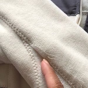 Cream and grey lightweight jacket with hood. Has zip pockets and can cinch from the inside to keep out the cold!! Has small spot on back of right arm where the stitching has become lose but in great condition!